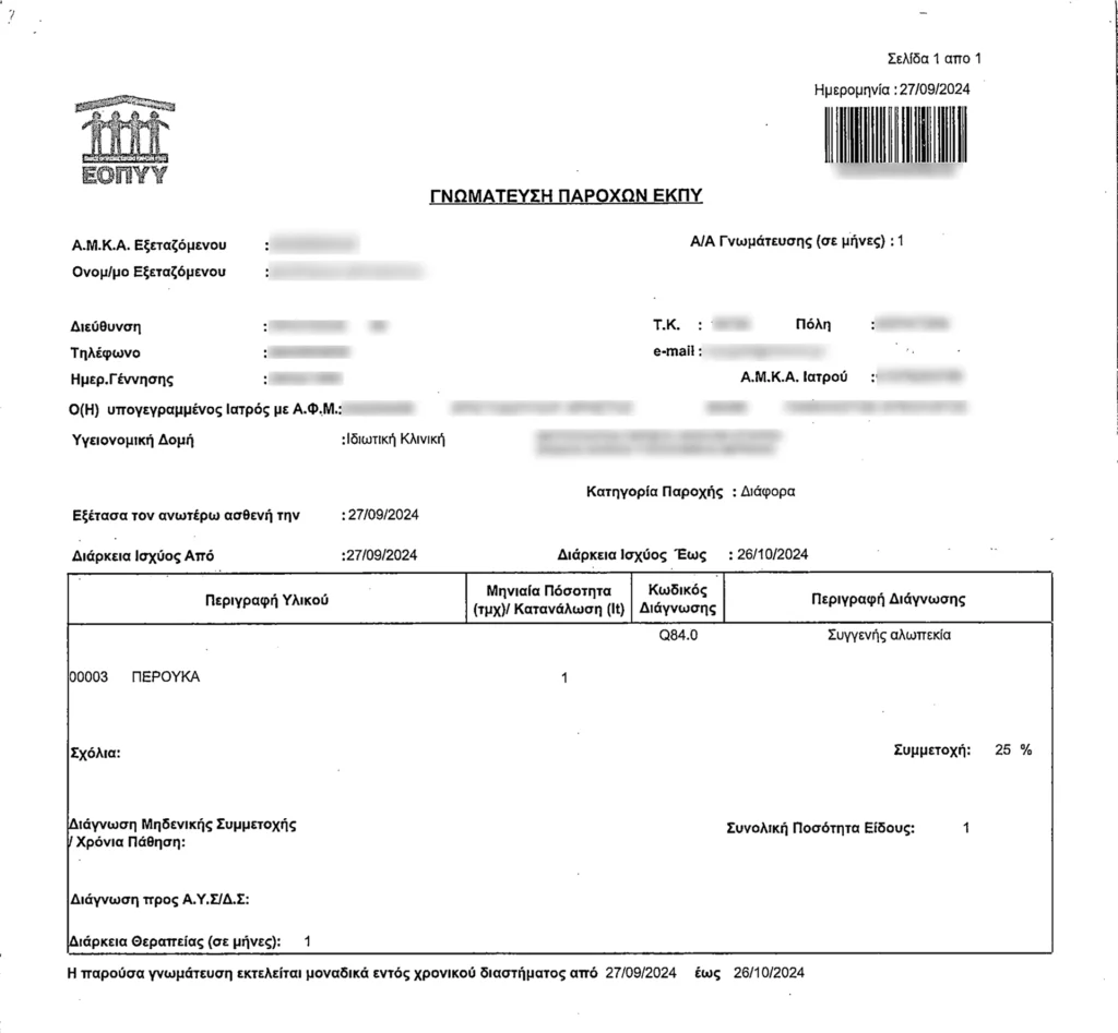 Ζητήστε από τον ογκολόγο σας να εκδώσει γνωμάτευση με την ένδειξη “Περούκα Παθήσεως”, πριν την αγορά σας.